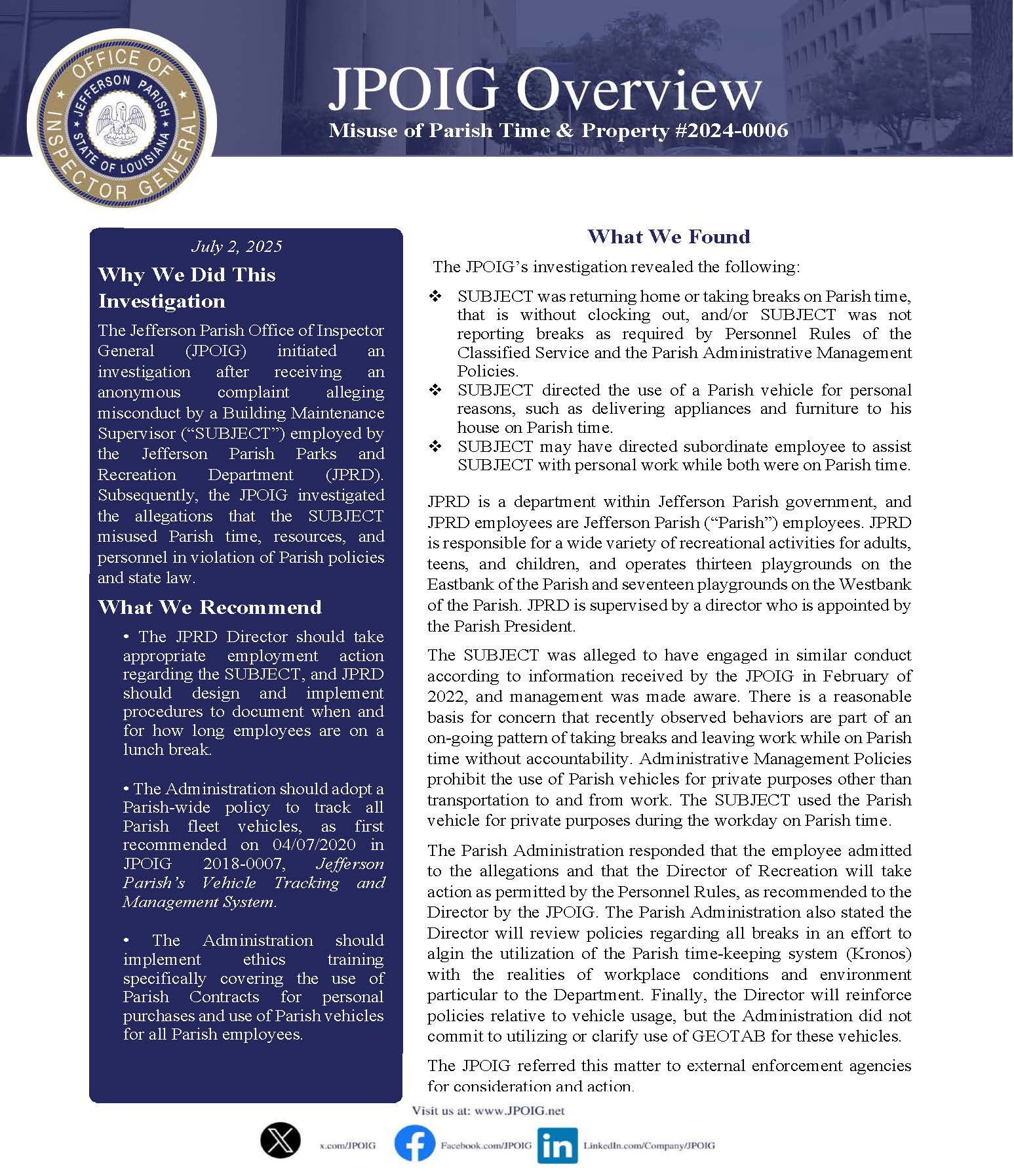 JPOIG 2024-0006 Misuse of Parish Time & Property Overview